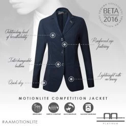 AA Platinum Motion Lite wedstrijdjas is een bijzonder rijjasje speciaal gemaakt voor de warme zomerdagen. Deze wedstrijdjas is uitgevoerd in een extreem lichtgewicht mesh stof, wat zeer ademend is en heeft een pasvorm als een tweede huid zonder voering.