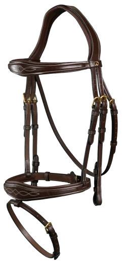 Dy’on collectie hoofdstel met anatomisch gecombineerde neusriem is gemaakt van Engels leer en heeft een anatomisch S-vormig kopstuk. Voorzien van crèmekleurige sierstiksels op de front- en neusriem en koperkleurige gespen.