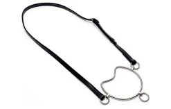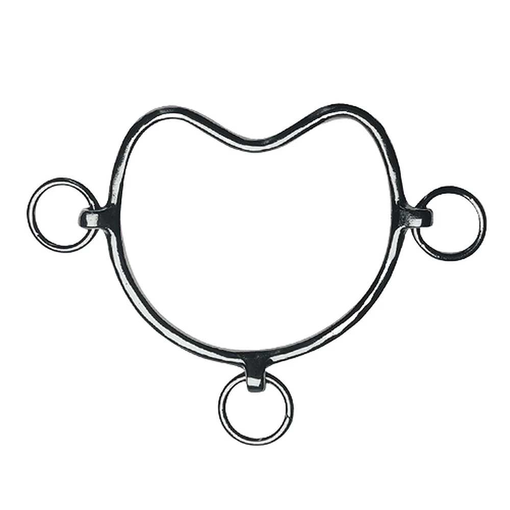 - Het dunne metalen cirkelvormige mondstuk loopt over de tong en achter de kin van het paard.