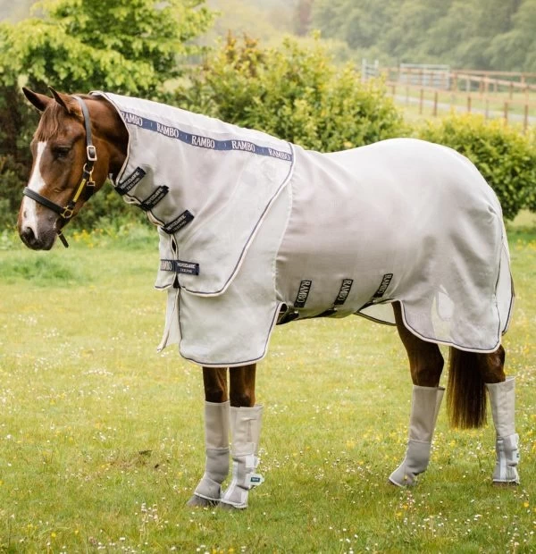 De Horseware Rambo Protector vliegendeken met afneembare hals biedt maximale bescherming tegen vliegen en insecten. De V-Front sluiting voorkomt drukking en wrijving op de schouder wat zorgt ervoor dat je paard comfortabel kan grazen.