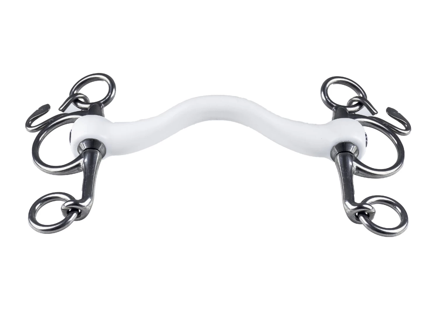 Hoe langer de scharen, hoe scherper de inwerking. - Een pelham kan gebruikt worden met 2 teugels; De ene teugel aan de bovenste ring voor een zachte aanleuning en de andere teugel aan de onderste ring voor het hefboomeffect van de pelham.